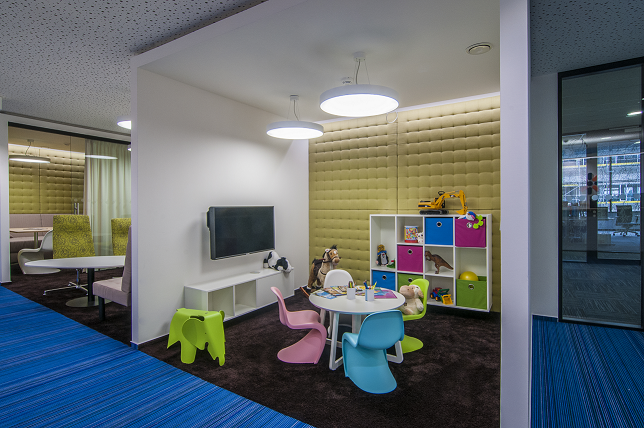 Projdete si zasedací místnosti, kanceláře i kuchyňky, které spíš připomínají kavárny. Na zdech se zelená mech, ke kterému ladí dřevěný nábytek. Prostor prosvětlují skleněné stěny s motivy barevných hrdinů PC her. Nechybí odpočívací místnosti s polstrovanými sedačkami i zdmi, fotbálek a společenská místnost s akváriem. Podíváte se i do vnitrobloku na park s bazénem a fontánami?