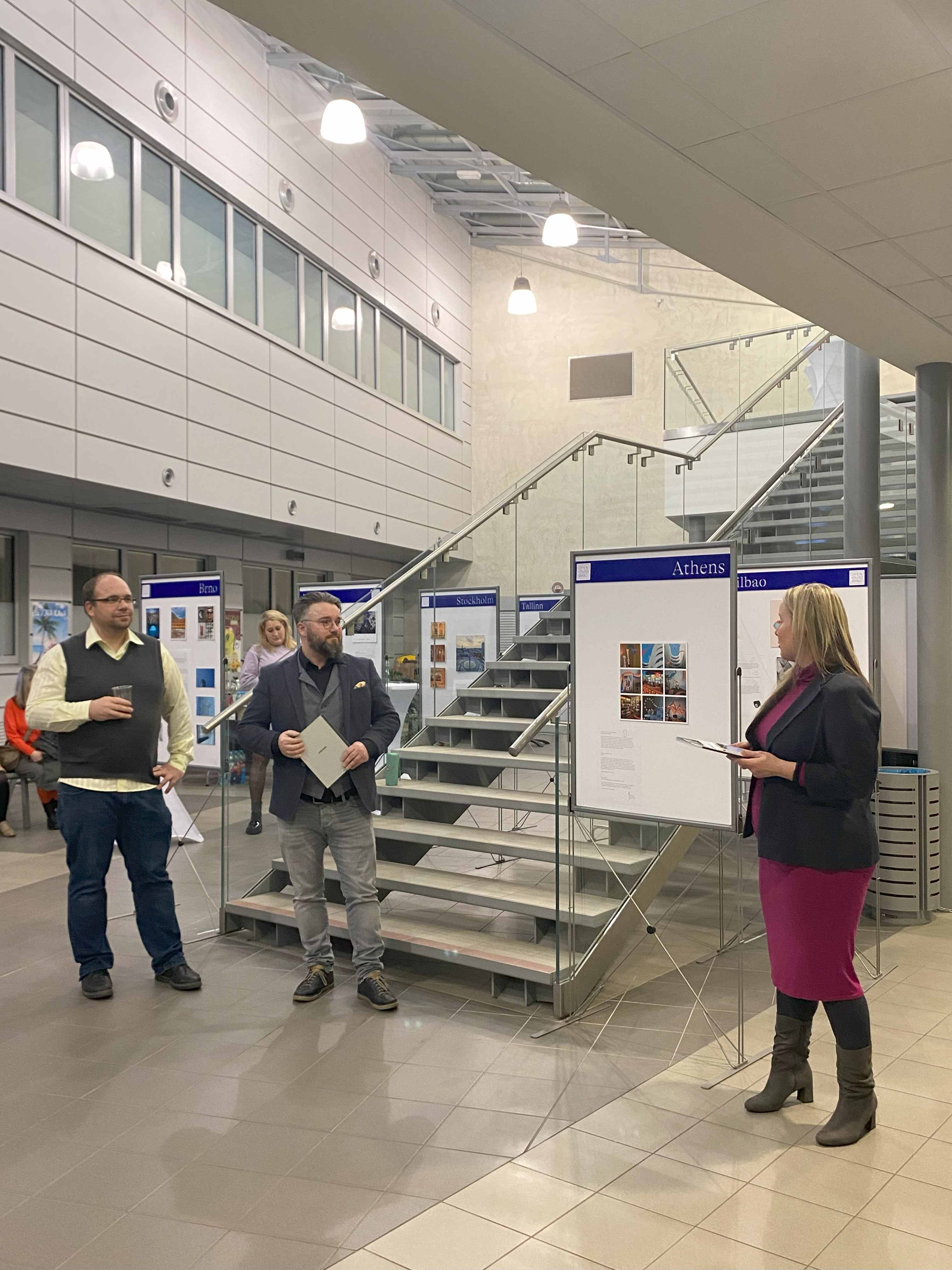 Poslední mluvčí večera byla kurátorka výstavy Mgr. Šárka Bahounková, která blíže představila zaměření výstavy a zdůraznila některé z budov: „Výchozím architektonickým dílem, na které jsme se zaměřili je samotné město, jež je strukturou staveb nejrůznějšího účelu. Proto je výstava rozdělena do šesti celků, které společně tvoří obraz celého města, jehož uživatelem je obyvatel ve věku 0+. Poměrně široké uchopení termínů inkluze a přístupnosti, které vykládáme v jejich prostorové i sociální rovině, nám dovolilo vytvořit různorodý výběr staveb, ať už se bavíme o jejich stáří, kvalitě jejich architektonického zpracování či funkci. Výběrem se nám podařilo zachytit mimo jiné také využití dnes nepotřebných technických objektů na sídlištích, praktické užití modulárních systémů nebo zajímavé konverze a rekonstrukce starších budov.” Bahounková pak volně návštěvníkům vernisáže osvětlovala jednotlivé oblasti. “Začínáme bydlením, kde představujeme městské bytové domy na ulici Vojtova nebo projekt sdílenéhobydlení pro seniory na ulici Zámečnická. Důležitou součástí městské infrastruktury jsou pak zdravotnická zařízení, kam jsme zařadili polikliniku na Lesné s příkladně zrekonstruovaným interiérem pediatrie, nebo FNUSA, kde máme umístěnou naši výstavu a kde již roku 1992 vznikl orientační systém pro nevidomé.Vzdělávání v České republice lze obecně pokládat svým systémovým nastavením dnes již za inkluzivní a podle toho jsme vybrali opravdu zajímavé budovy, kam se běžný občan nedostane. Z historického hlediska budovou bývalé Odborné školy pro ženská povolání Vesna poukazujeme na v první třetině 20. století běžnou genderově oddělenou výuku. Pěknou ukázkou plně bezbariérové školní budovy je SŠ F. D. Roosevelta a v ZŠ a MŠ Logopedické na Veslařské, která se specializuje na výuku dětí se závažnými řečovými poruchami, je pak příkladem školy s otevřeným způsobem výuky a pyramidový systém tříd – tedy systémem z něhož postupně odchází připravení žáci do běžných základních škol. Do sociální oblasti se dostala specializovaná zařízení jako Centrum Kociánka,Tyflocentrum, Domov pro seniory Nopova, Nízkoprahový klub Likusák a DROM, ale i zařízení s celospolečenským dosahem jako Komunitní centrum Skála nebo Společenské centrum Sýpka. Přístupnost a Inkluzi v kultuře znázorňujeme na Knihovně Jiřího Mahena, Divadle BARKA, jenž je jedním z mála bezbariérových divadel v hledišti i jevišti, a Muzeu romské kultury. Přístupnost sportu prezentujeme na trojici sokoloven. V Brně máme dokonce největší sokolovnu na světě, kterou je TJ Sokol Brno I se Stadionem. Poslední oblastí je infrastruktura a veřejný prostor, kde bych ráda zdůraznila nejmladší stavební realizace zachycené výstavou, a to park na Moravském náměstí a skatepark Mendlák, který je skateboardisty velmi dobře hodnocen mimo jiné proto, že je tam speciální prostor pro děti a začátečníky. Tím se zvyšuje například bezpečnost daného prostoru.“ Nemocnice je z kurátorčina pohledu opravdu dobrým příkladem plně přístupného interiérového veřejného prostoru v nitru města, protože je bezbariérový a otevřený bez výhrady všem lidem 24/7. Bahounková dále doplnila, že výstava byla z hlediska přístupnosti opatřena anglickým překladem a českým audio komentářem, v blízké budoucnosti bude také prezentována online i lidem, kteří ji nemohou fyzicky navštívit.