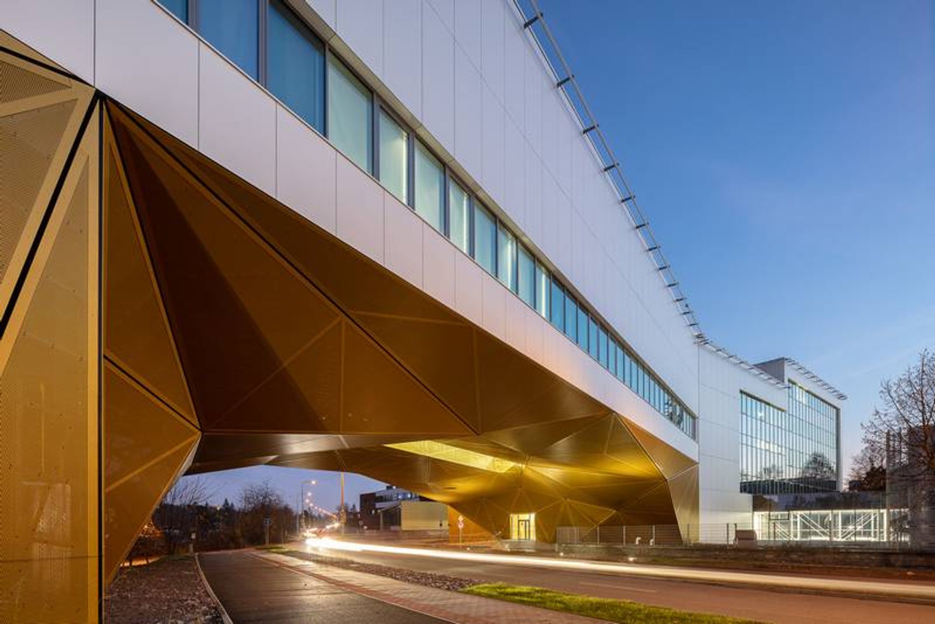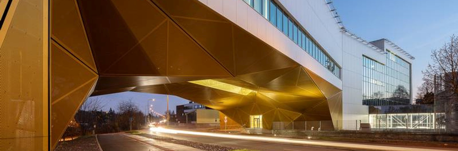 Objekt urbanisticky zakončuje akademickou část Univerzitního kampusu důstojnou dominantou, která zároveň od východu tvoří vstupní bránu do areálu. V jižní části objekt tvoří kompaktní blok s vnitřním atriem, z něhož vybíhá smělé přemostění ulice Kamenice podepřené podnoží v severní části pozemku. Hmota, byť půdorysně zalomená, je kompaktní a vytváří čistou kompozici ve východní části kampusu. Výtvarným akcentem jsou obklady perforovaným plechem zlaté barvy, které skulpturálně obalují podjezd nad Kamenicí a sestupují po noze podpírající objekt až k parkovišti u ulici Studentské.