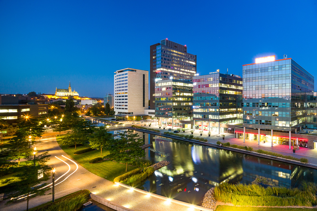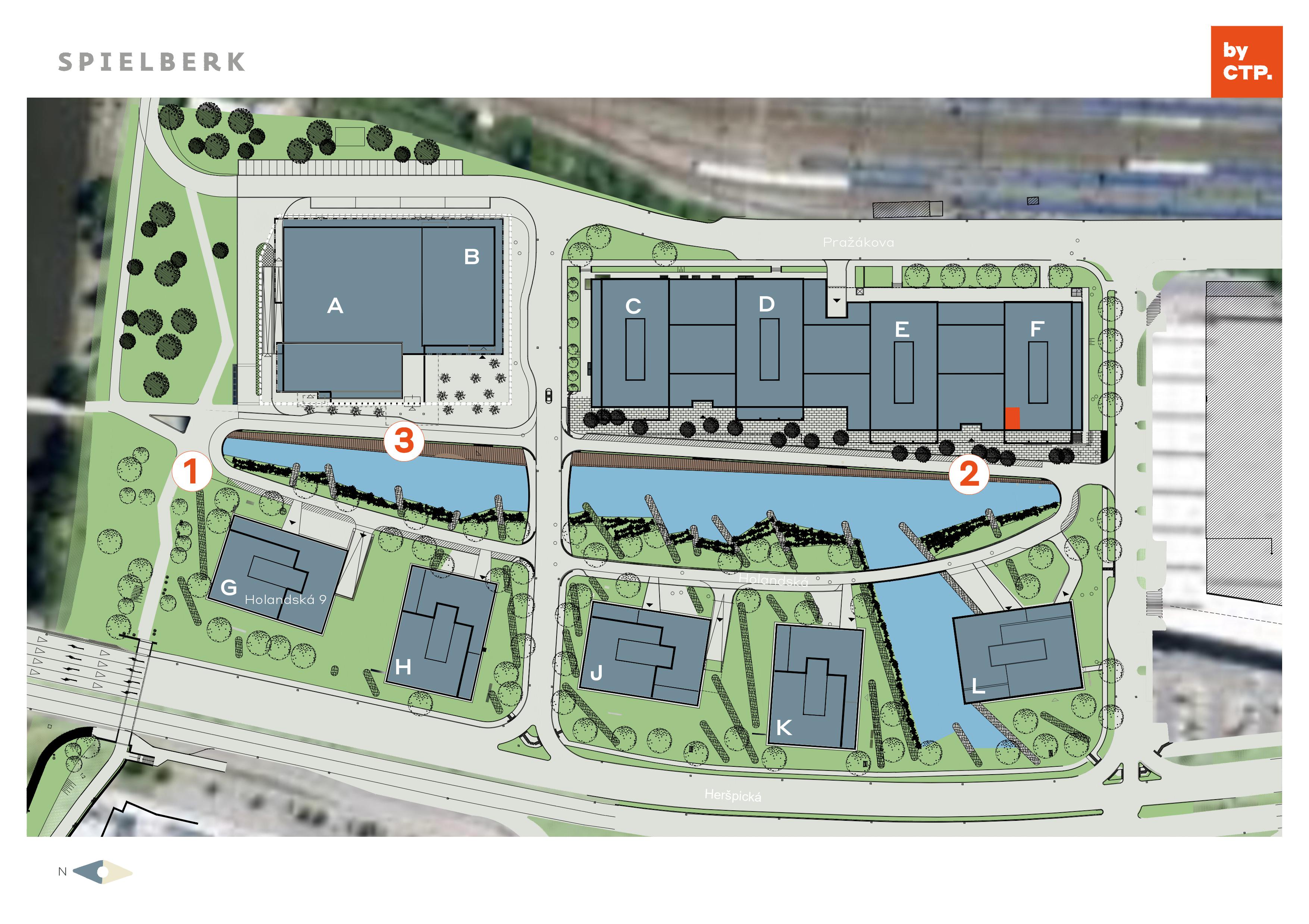 Jeho centrem jsou dvě podélné vodní plochy, které vytváří příjemný prostor pro relaxaci a odpočinek nejen pro zaměstnance společností sídlících v areálu, ale i pro obyvatele města Brna. Klíčovým motivem Spielberku je pak výhled na centrum města, zejména na nádhernou Katedrálu sv. Petra a Pavla.