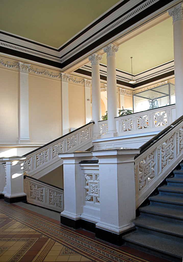 Interiéru budovy dominuje masivní reprezentativní schodiště ve vestibulu, ze kterého se rozbíhají do dvou stran klenuté chodby. Za povšimnutí také stojí mozaiková dlažba a decentní štuková výzdoba doplněná o technické motivy.