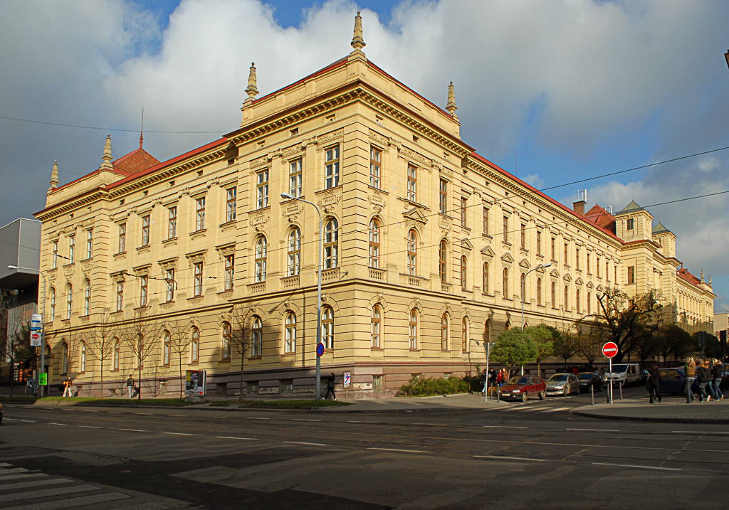 Dvoupatrová budova je koncipována jako trojkřídlá stavba, jejíž monumentální hlavní průčelí o délce 143 metrů zaujímá celou frontu tehdejší Lichtenauerovy (dnes Sokolské) ulice. Její křídla vymezená nárožními rizality hledí do dalších dvou ulic, Kounicovy a Veveří. Dominantu budovy tvoří osová vstupní část s dvojicí sdružených iónských polosloupů, která je vymezena dvěma věžovitými útvary.